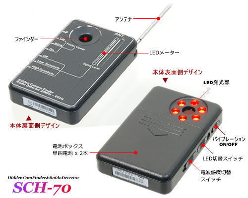 SCH-70はカメラに向け照射したLED光をカメラのレンズが反射し同期する現象を利用したスパイカメラ発見器です。